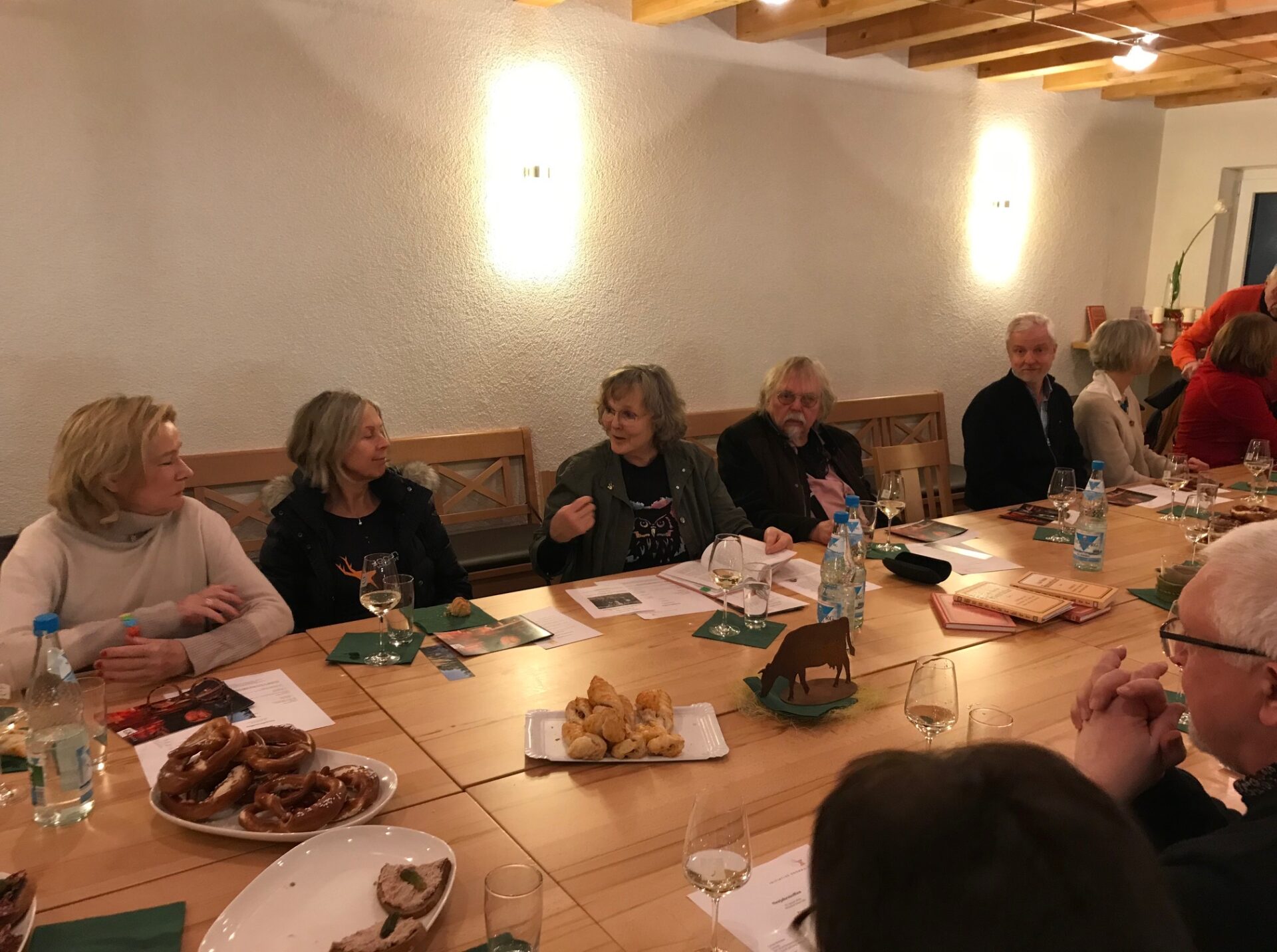 Gabi Frank hat unsere Mitglieder wohlbehalten abgeholt und wieder nach Hause gebracht, dies ein besonderer Service im Rahmen eines Shuttle – Dienstes. Leona Riemann hatte einige literarische Stücke mitgebracht, die teilweise zum Nachdenken anregten und teilweise sehr amüsant waren. Mehrmals änderte sie ihre persönlichen Vorgaben, um auf die aktuelle Diskussion in der Runde einzugehen. Leona Riemann präsentierte sich als sehr flexible Lektorin. Jedes Stück regte zu einer neuen Diskussion in der Runde an. Georg Kiltz präsentierte 7 verschiedene Weinsorten und dies mit den jeweiligen Hintergrundinformationen, über die Art und Weise und die historische Entwicklung der einzelnen Weinsorte. Als Ehrengast konnten wir Karl-Heinz Bange begrüßen, der uns über die historische und aktuelle Entwicklung des Hofguts Marienborn informierte. 300 Stück Vieh und ca. 5.000 Kunden wollen versorgt sein.